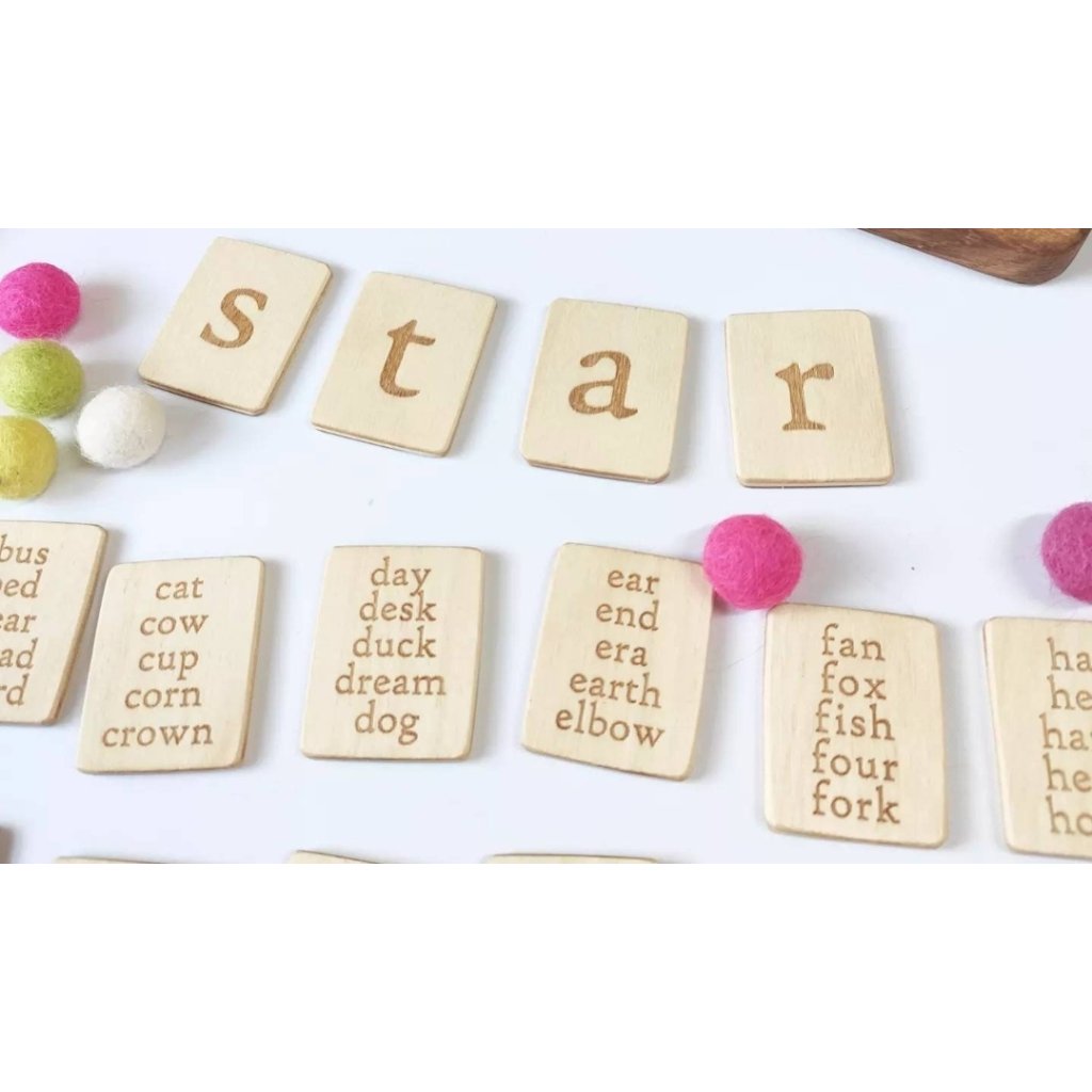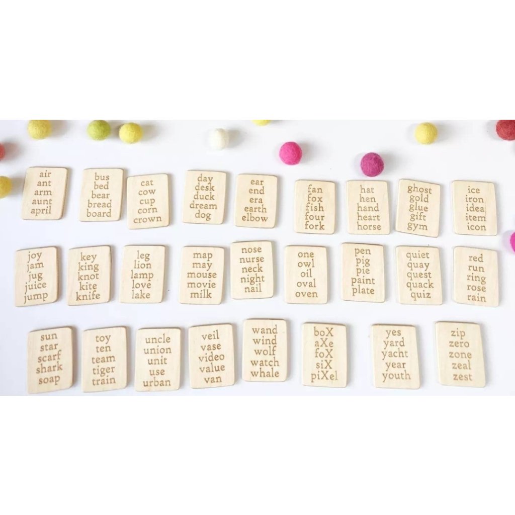 Sada drevených obojstranných kariet s písmenami. Na zadnej strane kariet je 5 slov, ktoré začínajú na dané písmeno. Písmená v týchto slovách sa neopakujú. Okrem toho si dieťa precvičuje písanie anglických slov, ich čítanie a výslovnosť.